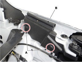 Ослабив крепежные зажимы (А), затем отсоедините боковую крышку крыла (В).