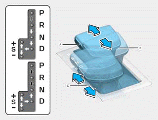 A: Рычаг переключения передач, B: Кнопка разблокировки переключения передач, C: ручной режим переключения