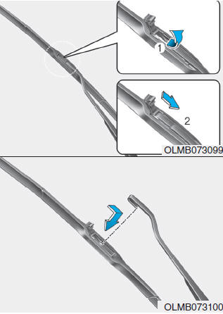 2. Поднимите зажим щетки стеклоочистителя (1). Затем потяните вниз блок лезвий (2) и убери это.