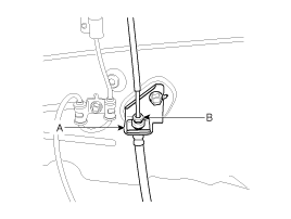 Отсоедините тормозную трубку, ослабив накидную гайку трубки (В).