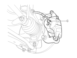 Отсоедините тормозной шланг от тормозного суппорта, ослабив болт (С).