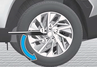 13. С помощью колесного ключа затяните колесные гайки в указанном порядке. Дважды проверяйте каждую колесную гайку, пока они тесные. После замены шин, иметь официального дилера HYUNDAI затяните колесные гайки до упора крутящий момент как можно скорее. Затянуть колесные гайки до 79-94 lbf.ft (11-13 кгс.м).