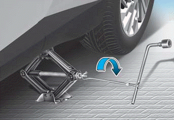 8. Вставьте ручку домкрата в домкрат. и поверните его по часовой стрелке, подняв автомобиль, пока шина не оторвется от земли. Убедитесь, что автомобиль устойчив на Джек.
