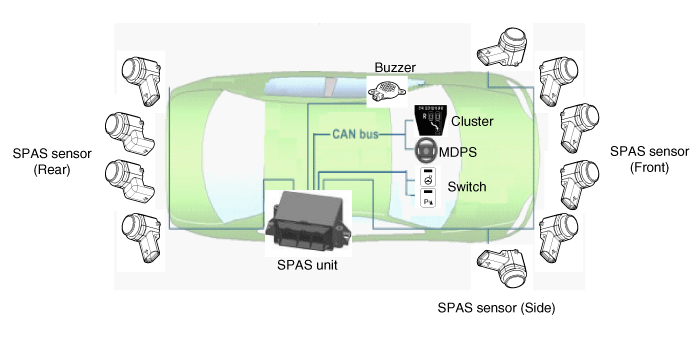 • Вывод SPAS HMI (человеко-машинный интерфейс): ход парковки и предупреждение об объекте.
