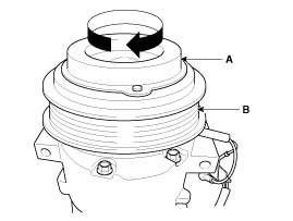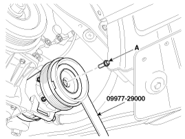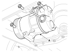 Отсоедините разъем муфты компрессора, а затем снимите 3 крепежных болта и компрессор (А).