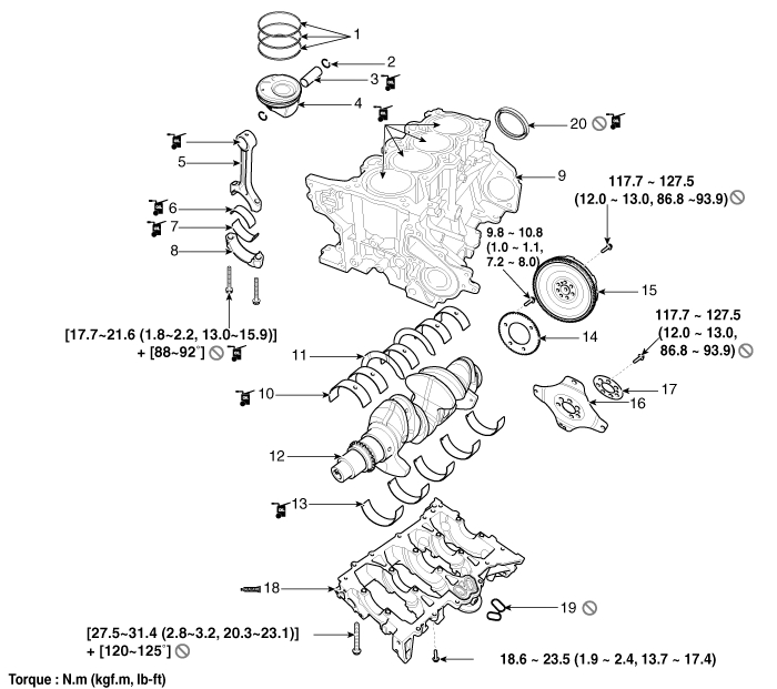 9. Блок цилиндров 10. Верхний подшипник коленчатого вала 11. Упорный подшипник коленчатого вала 12. Коленчатый вал 13. Нижний подшипник коленчатого вала 14. CKPS (Датчик положения коленчатого вала) колесо |