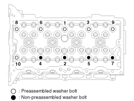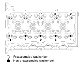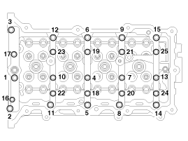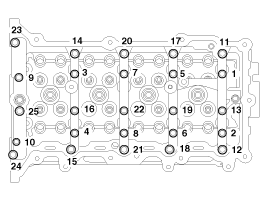 С помощью SST (09221-4A000) установите и затяните 10 болтов крепления головки блока цилиндров в несколько проходов в указанной последовательности.