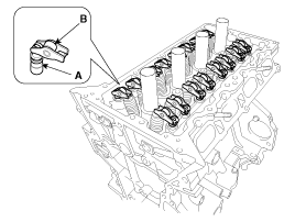 Снимите HLA (гидравлический компенсатор зазора) (A) и поворотный рычаг (B).
