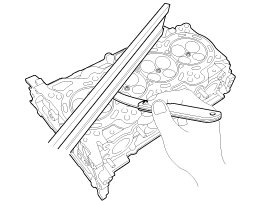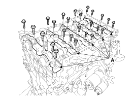 Аккуратно поместите головку блока цилиндров (А), чтобы не повредить прокладку головки блока цилиндров во время установки.