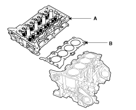 Установите прокладку головки блока цилиндров (В) на блок цилиндров.