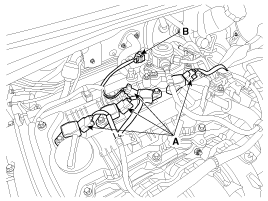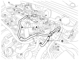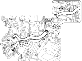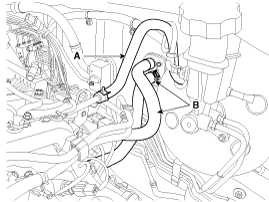 Отсоедините топливный шланг (A) и шланг PCSV (электромагнитный клапан управления продувкой) (B).