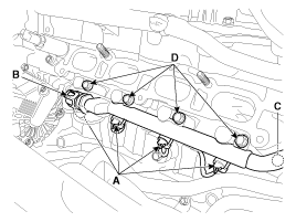 Снимите установочный болт (D), а затем снимите напорную трубу и форсунку с двигателя.