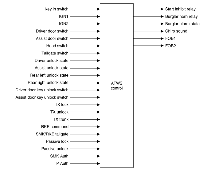 Сигналы ЗАКРЫТЬ / РАЗБЛОКИРОВАТЬ и паника принимаются от передатчика, а сигналы ЗАПИРАТЬ / РАЗБЛОКИРОВАТЬ ДВЕРИ и паники выводятся.