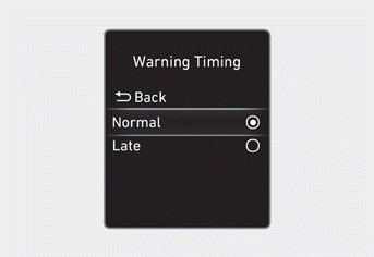 При включенном зажигании перейдите к User Настройки > Помощь водителю > Предупреждение Синхронизация (для типа кластера) или Настройка > Автомобиль > Помощь водителю > Предупреждение Хронометраж (для типа информационно-развлекательной системы) в меню настроек, чтобы изменить время срабатывания начального предупреждения. Предупреждение Тайминг установлен на «Нормальный» на заводе.