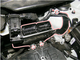 Снимите крепежные болты (А) и гайку (В), затем снимите узел кронштейна блока ЕСМ (С).