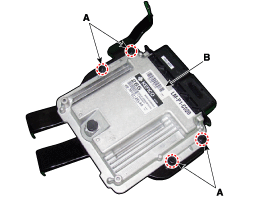 Отверните монтажные гайки (А) и снимите блок ЕСМ с узла кронштейна блока ЕСМ (В).