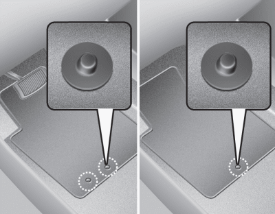 Ваш автомобиль был изготовлен с креплениями для напольных ковриков со стороны водителя, предназначенными для надежно удерживайте напольный коврик на месте. Во избежание каких-либо помех работе педали, HYUNDAI рекомендует использовать только напольные коврики HYUNDAI, предназначенные для использования в вашем автомобиле. установлен.