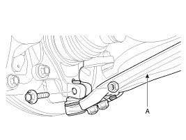 Снимите шпильку и корончатую гайку, а затем отсоедините конец рулевой тяги (А) от переднего поворотного кулака.