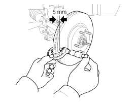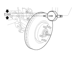 Поместите циферблатный индикатор примерно в 5 мм (0,2 дюйма) от внешней окружности тормозного диска и измерьте биение диска.