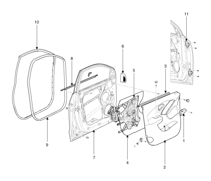 8. Дверной ремень снаружи уплотнителя 9. Уплотнитель со стороны двери 10. Боковой уплотнитель кузова 11. Дверная петля |
