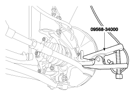 Снимите шпильку и корончатую гайку, а затем отсоедините конец рулевой тяги (А) от переднего поворотного кулака.