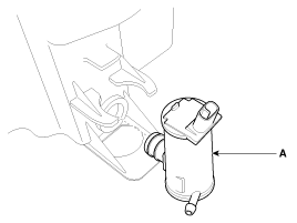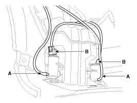 Снимите шланг омывателя (А) и отсоедините разъем электродвигателя омывателя (В).