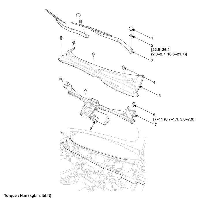 Hyundai Tucson: Компоненты и расположение компонентов двигателя стеклоочистителя/омывателя/переднего стеклоочистителя