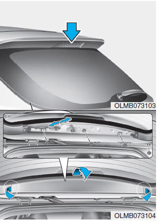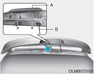5. Снимите верхний стоп-сигнал в сборе (A) после ослабления гаек и форсунка омывателя (В).