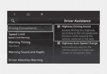 При включенном зажигании перейдите в меню «Настройка». > Автомобиль > Помощь водителю > Вождение Удобство > Ассистент вождения на шоссе (для информационно-развлекательной системы) от Меню настроек, чтобы включить Highway Driving Помощь включается и выключается.