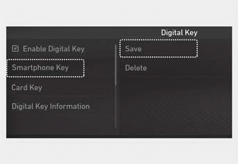 2. Зарегистрируйте свой цифровой ключ (смартфон ключ) в информационно-развлекательной системе. От меню Настройки, перейдите в Настройка > Автомобиль > Цифровой ключ > Смартфон Ключ, а затем выберите Сохранить.