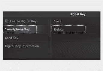 2. Удалите свой цифровой ключ (смартфон ключ) в информационно-развлекательной системе. От меню Настройки, перейдите в Настройка > Автомобиль > Цифровой ключ > Смартфон Ключ, а затем выберите Удалить.