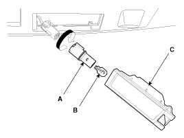Поверните патрон лампы номерного знака (A) против часовой стрелки, чтобы снять лампу (B) с рассеивателя (C).