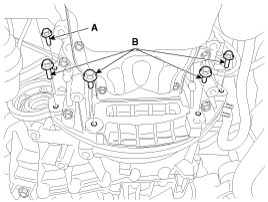 Снимите болты верхнего крепления коробки передач (B-2ea) и болты крепления стартера (A-2ea).
