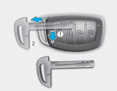 Нажмите и удерживайте кнопку разблокировки (1) и извлеките механический ключ (2). Вставлять механический ключ в замочную скважину на двери.