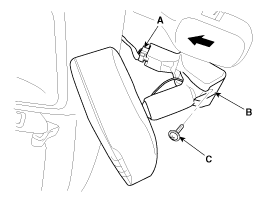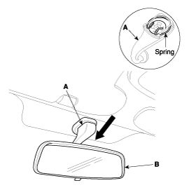 Нажмите на основание внутреннего зеркала заднего вида (А) вниз, чтобы снять внутреннее зеркало заднего вида в сборе (В).