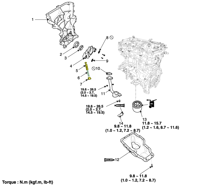 9. Уплотнительное кольцо (сторона нагнетания) 10. Прокладка масляного экрана 11. Масляный экран 12. Масляный поддон 13. Масляный фильтр 14. OPS (датчик давления масла) |