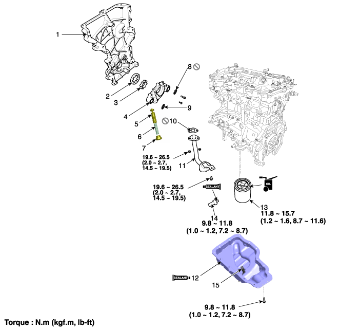 9. Уплотнительное кольцо (сторона нагнетания) 10. Прокладка масляного экрана 11. Масляный экран 12. Масляный поддон 13. Масляный фильтр 14. OPS (датчик давления масла) 15. Датчик уровня масла |