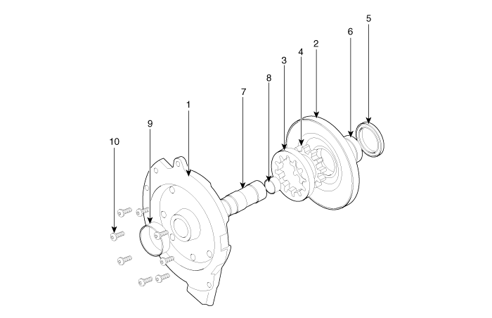2. Корпус масляного насоса 3. Ведомая шестерня 4. Привод 5. Сальник |