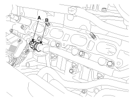 Отсоедините разъем датчика давления в рампе (А), а затем снимите датчик (В) с напорной трубы.
