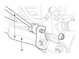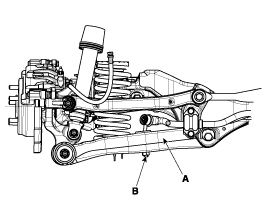 Ослабьте гайку и снимите заднюю стойку стабилизатора (В) с задним нижним рычагом (А).