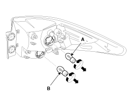 Поверните патрон против часовой стрелки, чтобы снять лампу фонаря заднего хода (А) и лампу заднего фонаря (В).