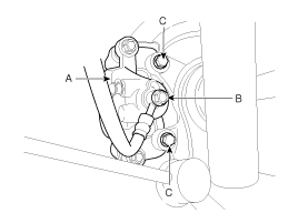 Ослабьте рым-болт шланга (B) и болты крепления суппорта (C), затем снимите задний суппорт в сборе (A).