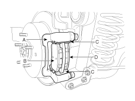Замените прокладку колодки (D), фиксаторы колодки (C) и тормозные колодки (B) в кронштейне суппорта (A).