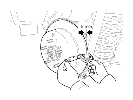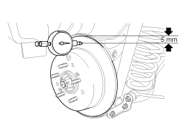 Поместите циферблатный индикатор примерно в 5 мм (0,2 дюйма) от внешней окружности тормозного диска и измерьте биение диска.