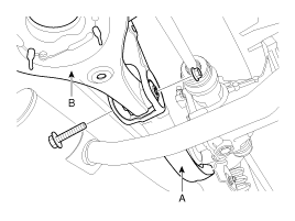 Ослабьте болт и гайку, затем снимите задний нижний рычаг (В) с подрамником (А).