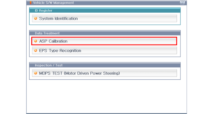После выбора «модели автомобиля» и «системы» выберите «Калибровка ASP» на экране выбора автомобиля GDS.