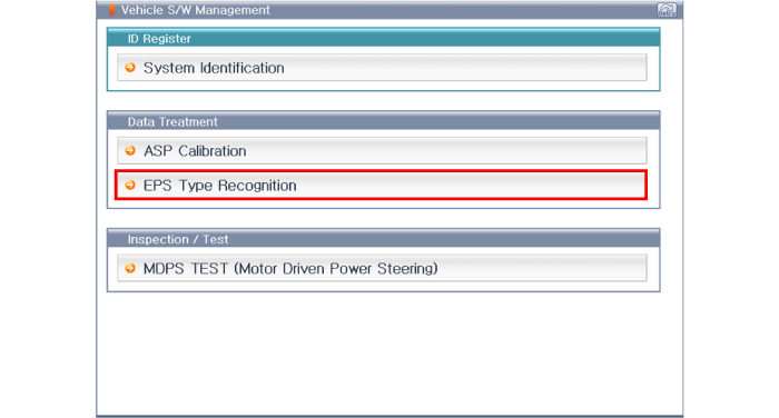 После выбора «модели автомобиля» и «системы» выберите «Распознавание типа EPS» на экране выбора автомобиля GDS.