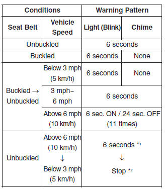 *1 : Шаблон предупреждения повторяется 11 раз с интервалом в 24 секунды. Если ремень безопасности водителя пристегнут, индикатор погаснет в течение 6 секунд и подаст звуковой сигнал немедленно остановится.