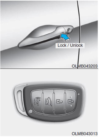 Чтобы запереть двери, нажмите кнопку на внешней ручке двери, неся смарт-ключ с собой или нажмите кнопку блокировки двери на смарт-ключе.