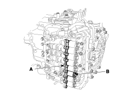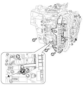 Отсоедините разъем электромагнитного клапана (В) и датчик температуры масла (А) от корпуса клапана.